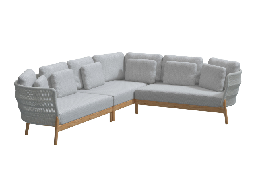 Charakteristisch für die 4Seasons Avalon Living-Garnitur I ist das stabile Gestell aus Teakholz mit seinem natürlichen Finish, das eine warme, einladende Stimmung kreiert. Eine graue Seilbespannung und farblich abgestimmte Polsterkissen vervollständigen das ansprechende Design.