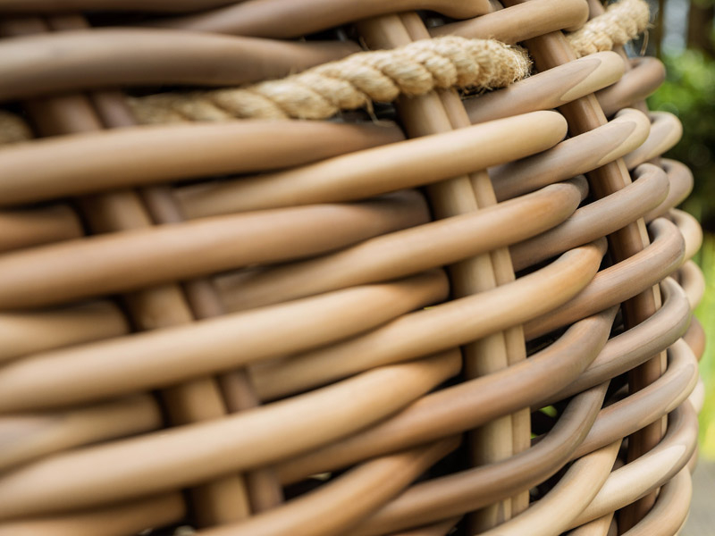 Als herausragendes Merkmal des Apple Bee Cocoon Lounge Sofas gilt die Verwendung von Sisalseil, welches das charakteristische Kokon-Design betont. Weiterhin sind die Kissen in puncto UV-Beständigkeit und Wasserabweisung optimal für den Einsatz im Freien konzipiert. Sie können mittels Handwäsche mit mildem Detergens und einer Bürste gereinigt werden. Für zusätzlichen Sitzkomfort sorgt die Quick Dry Foam-Füllung in den Polstern, die durch ihre offenporige Unterstruktur rasch trocknet, sodass das Sofa auch auf dem Balkon eine gute Figur macht.