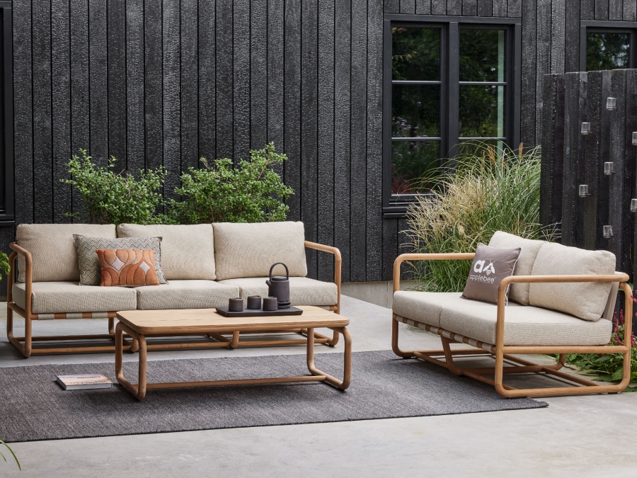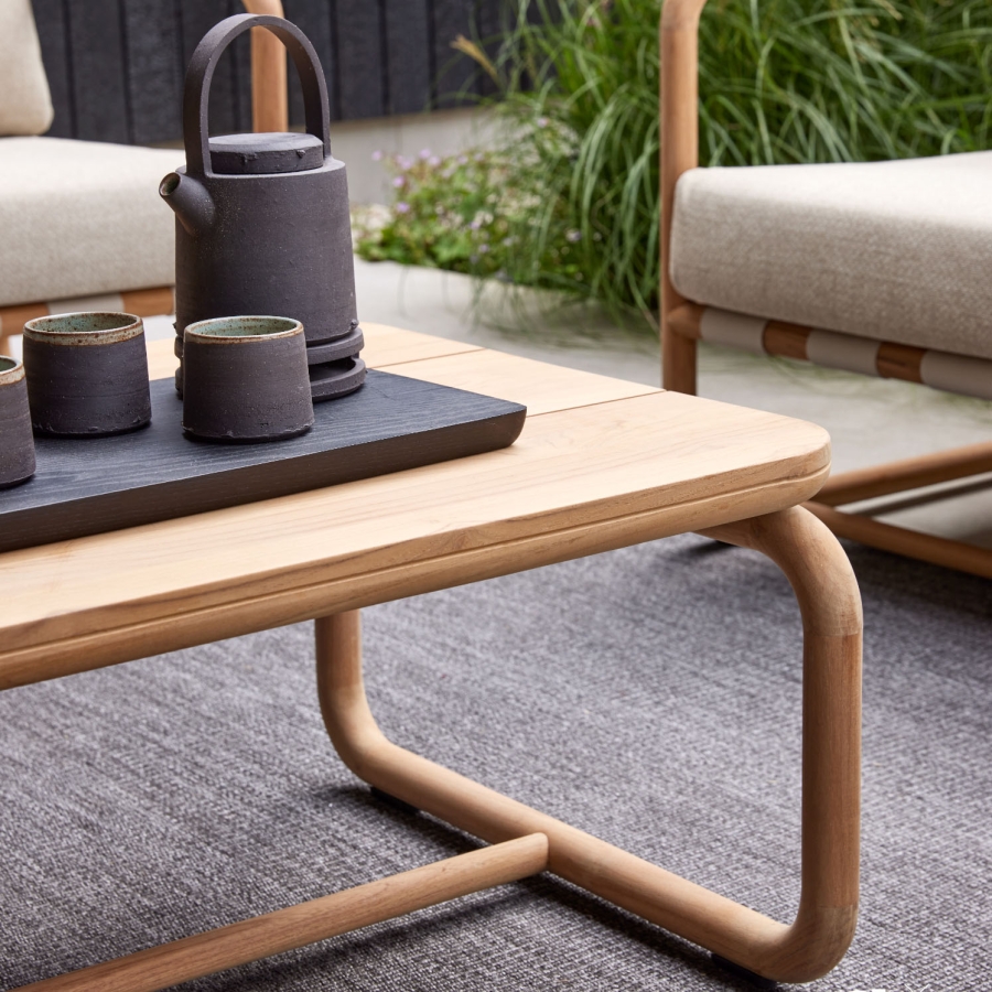 Der Dolce Kaffeetisch von Apple Bee besteht hauptsächlich aus witterungsbeständigem Teakholz. Teakholz ist bekannt für seine Strapazierfähigkeit und Langlebigkeit, was es zur idealen Wahl für Outdoor-Möbel macht. Es ist äußerst resistent gegen Umwelteinflüsse und entwickelt mit der Zeit eine ansprechende natürliche Patina. Das Holz dieses Tisches kommt in seiner natürlichen Farbgebung daher und fügt sich mühelos in jede Terrassen- oder Balkongestaltung ein.