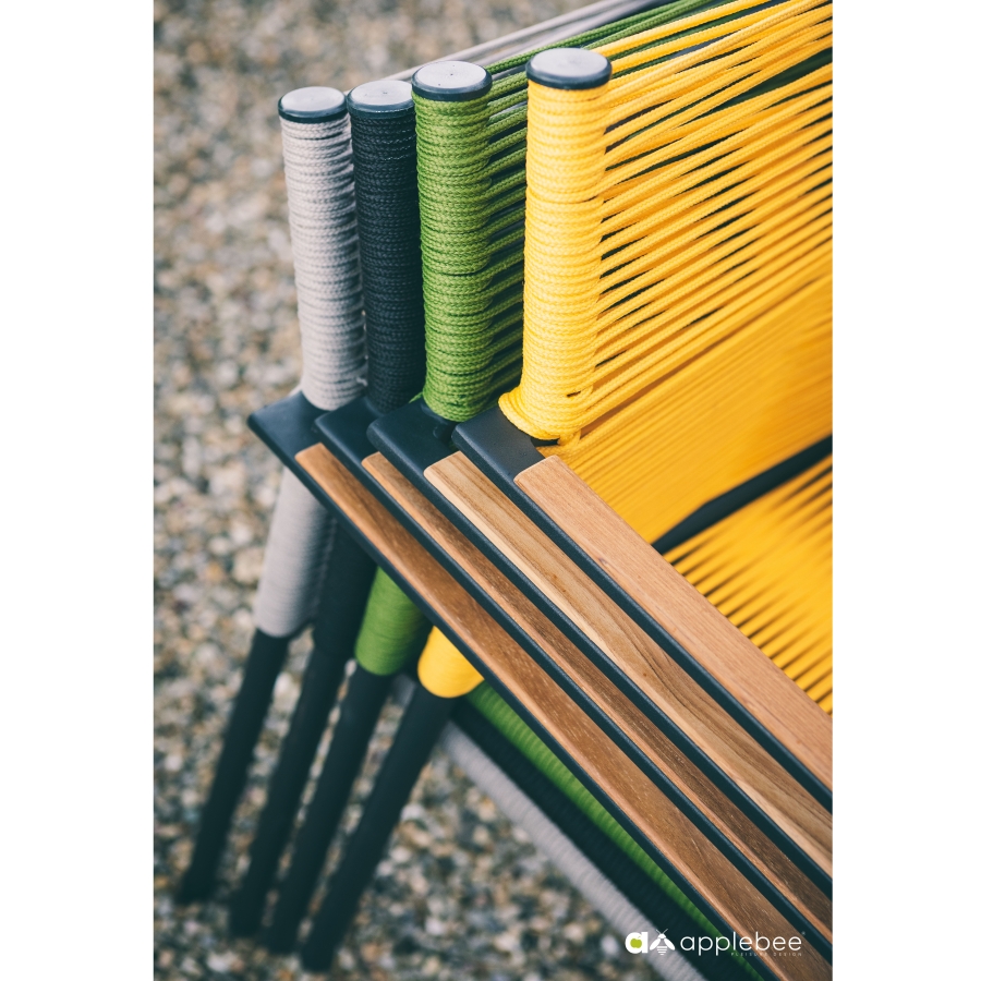 Der Apple Bee Jakarta Armlehnstuhl in Grau ist vorrangig aus strapazierfähigem Aluminium mit Pulverbeschichtung gefertigt, wobei das Rahmenwerk in einem matten Schwarz daherkommt. Zur Bespannung dieses Gartenstuhls wird ein Seil verwendet, das für seine Widerstandsfähigkeit und Abriebfestigkeit bekannt ist. Ergänzt werden diese Materialien durch Armlehnen aus hochwertigem Teakholz, das dem Stuhl eine warme und natürliche Ausstrahlung verleiht.