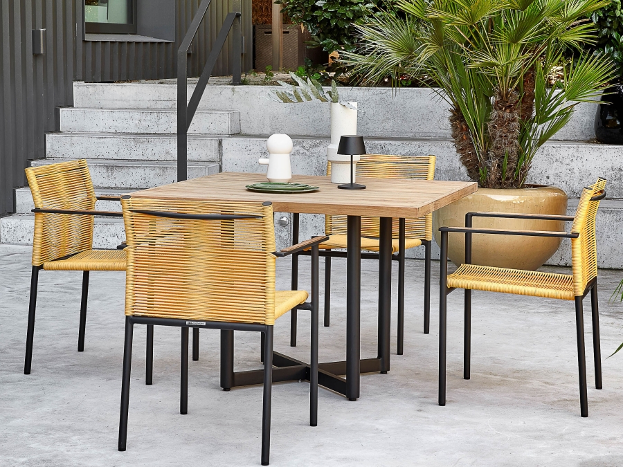 Der Apple Bee Jakarta Armlehnstuhl in der Farbe Lemon besticht durch seine erstklassige Qualität und sein modernes Design. Dieser Gartenstuhl, gebaut aus korrosionsfreiem Aluminium und versehen mit einer edlen mattschwarzen Pulverlackierung, ist ein ideales Möbelstück für Ihren persönlichen und behaglichen Garten. Die komfortable Sitzfläche, bestehend aus einem Seilgeflecht, wird von geschmackvollen Teak-Armlehnen umrahmt. Mit lediglich rund 4,8 kg ist der Stuhl dennoch stabil und leicht.