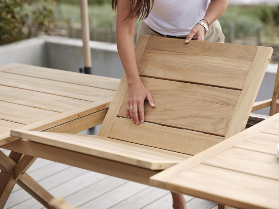 Der Brafab Brutus Ausziehtisch ist hauptsächlich aus Teakholz gefertigt, welches für seine Beständigkeit und ästhetische Erscheinung bekannt ist. Die natürliche Farbgebung betont das elegante, ländliche Aussehen des Tisches und eine spezielle Behandlung der Oberfläche schützt das Holz vor frühzeitigem Ergrauen. Dieses Material verleiht dem Tisch nicht nur eine schöne Optik, sondern auch eine hohe Widerstandskraft gegen Umwelteinflüsse.
