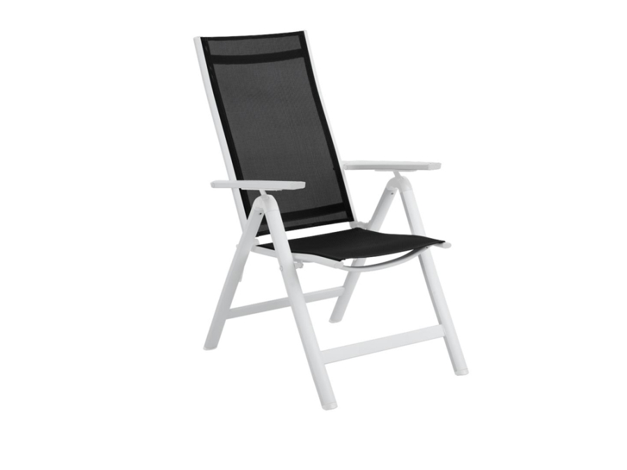 Das stabile Gestell des Stuhls besteht aus Aluminium mit einer schützenden weißen Pulverbeschichtung. Für die Sitzfläche wurde strapazierfähiges Polypropylen verwendet, welches den Stuhl gegen Wettereinflüsse beständig macht. Die schwarze Sitzbespannung bildet einen attraktiven Kontrast zum weißen Rahmen.