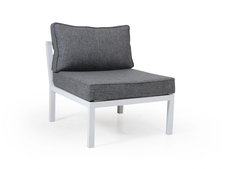 Als Teil der Weldon-Serie von Brafab fällt das Weldon Center unter die Rubrik der Loungemöbel und eignet sich besonders für die Nutzung auf Balkonen. Sein Alurahmen ist mit einer Pulverbeschichtung versehen, die in einem matten Weiß schimmert, während die grauen Kissen das Design stimmig abrunden.