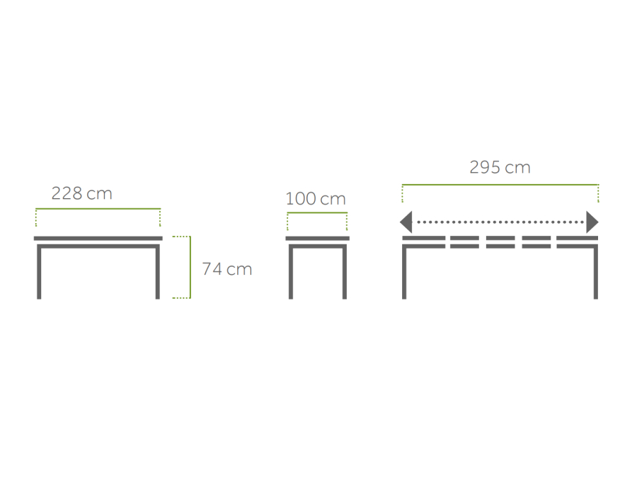 Der MWH Alutapo Gartentisch bietet großzügige Dimensionen, die ihn ideal für größere Gesellschaften machen. Mit einer Gesamtbreite von ca. 228 cm und einer zweiten Gesamtbreite von ca. 295 cm sowie einer Gesamttiefe von ca. 103 cm und einer Gesamthöhe von ca. 74 cm ist er sowohl funktional als auch bequem. Das Gesamtgewicht beträgt etwa 45 kg.