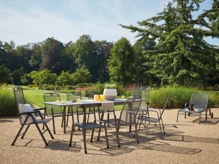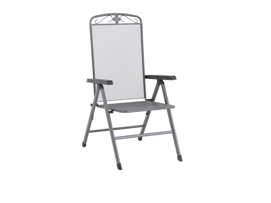 klappbar, witterungsbeständig, UV-beständig, Rückenlehne 5-fach verstellbar, max. Belastung 110kg, pflegeleicht, florales Dekorelement in der Rückenlehne