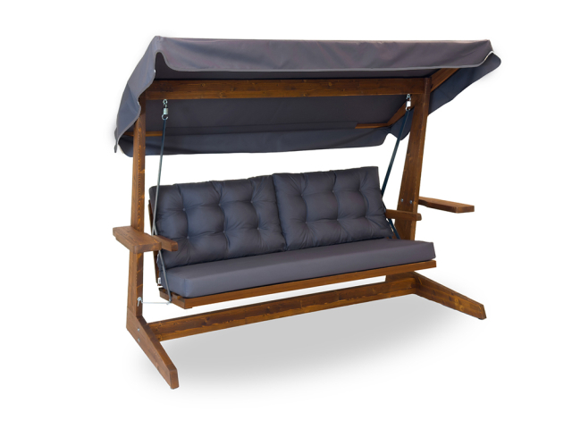 Nicht nur der Ausdruck von Eleganz und Exklusivität, sondern auch das außergewöhnliche Komforterlebnis macht den Charme dieser Hollywoodschaukel aus. Ihr stabiles Gestell aus massiver Fichte, in ansprechendem Braunton gehalten, verleiht dem Produkt sowohl die notwendige Stabilität als auch ein attraktives Design. Das Gestell harmoniert perfekt mit der Farbgebung des abnehmbaren, schwenkbaren und UV-Schutz bietenden Sonnendachs, sowie der Polster, die beide aus Outdoor-Gewebe in elegantem Anthrazit gefertigt sind.