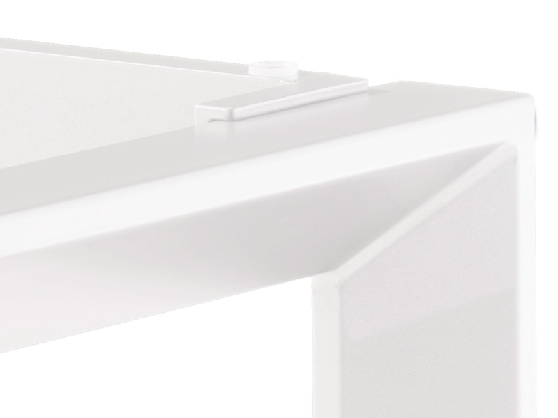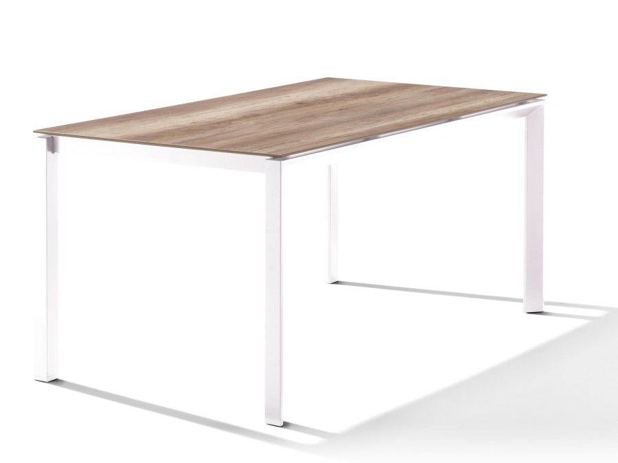 Das Untergestell des Tisches ist aus Aluminium gefertigt und hat eine weiße Polyesterbeschichtung. Die Tischplatte besteht aus High Pressure Laminate (HPL), was für hohe Belastbarkeit und Langlebigkeit steht. Die helle Eichenoptik sorgt für ein modernes und ansprechendes Design des Tisches.