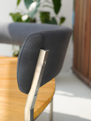 Das Onyx-Oryx Edge Gartenmöbel-Set ruht auf einem Rahmen aus Edelstahl, während die Tischplatte und die Sitzflächen aus wiederverwertetem Teakholz gefertigt sind. Das Holz verleiht dem Set eine heimische und warme Ausstrahlung und wird komplettiert durch das graue Polyacryl-Gewebe der Bezüge.
