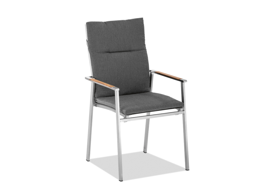 Die Polsterauflage präsentiert sich in der Farbgebung Royal-graphit, einem stilvollen und neutralen Ton, der sich nahtlos in jede Umgebung einfügt. Der Bezug bietet ein warmes und einladendes Erscheinungsbild, das Gäste willkommen heißt, und zeichnet sich durch seine leichte Pflege und seine Wasserbeständigkeit aus – perfekt für den Außeneinsatz.